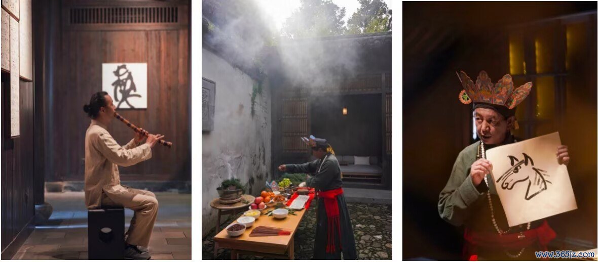 江南与滇西的古老艺术,于这个春日静静交汇。法云安缦百年古宅天井中,尺八奏者独坐,音色苍凉如松风过涧,吹彻唐宋余音。大研安缦则邀来纳西东巴,以松柏之枝点燃古意,为远客祈福。现场亦备笔墨纸砚,从甲骨篆隶到东巴象形,于书写间触碰两种文字背后的山川与智慧。