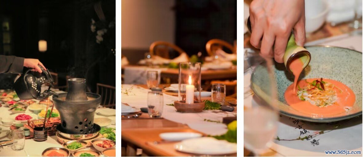 中餐晚宴从一只尼西黑陶火锅开始。源自香格里拉尼西村的黑陶锅,炭火慢煨之间,牦牛肉的醇厚与腊排骨的咸鲜各自成味,是大研缦逸轩中餐厅的经典表达。随火锅一同抵达的,还有云南春日山野的可食鲜花:金盅花、金雀花、石斛花、海花菜,轻涮入汤,花瓣舒展,清甜中带着高原的春意。黑松露与野生羊肚菌也在锅中沉浮,菌香随热气升腾。火锅之外,法云蒸菜馆的春季新菜轻巧落于席间:椒麻竹笙帽、春笋豆腐盒、指橙银鳕鱼清雅开场,龙井炖鲟龙鱼筋温润入喉,龙井问茶河虾仁、春笋豆瓣煮蛏子、百花时蔬,如田园小景次第而来。大研的经典与法云的焕新,在同一张餐桌上相遇,山与水,于此有了可尝的温度。