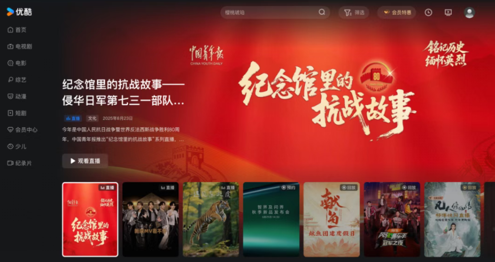 优酷方面,除了“胜利日”专栏以外,平台还联合打造了红色主题网络文化综艺《信仰的足迹——北京文化记忆》、直播系列活动《纪念馆里的抗战故事——铭记历史缅怀英烈》等等主题作品。同时配合精品节目排播带,激发着大众的历史责任感与爱国热情。