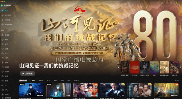 再看网络视听平台。在“铭记抗战历史 传承伟大精神”的主题下,爱奇艺、腾讯视频、优酷、芒果等纷纷开设相关特色专区,通过集纳跨题材、跨年代、跨文化的经典作品矩阵,为观众打造沉浸式光影空间。