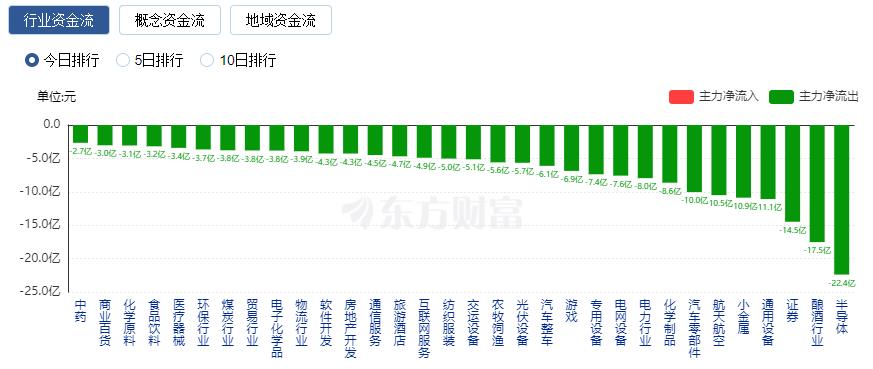净流出方面,半导体、酿酒行业、证券等净流出排名靠前,其中半导体净流出22.39亿元。