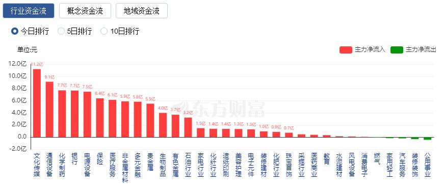 行业资金方面,截至收盘,文化传媒、通信设备、化学制药等净流入排名靠前,其中文化传媒净流入11.19亿。